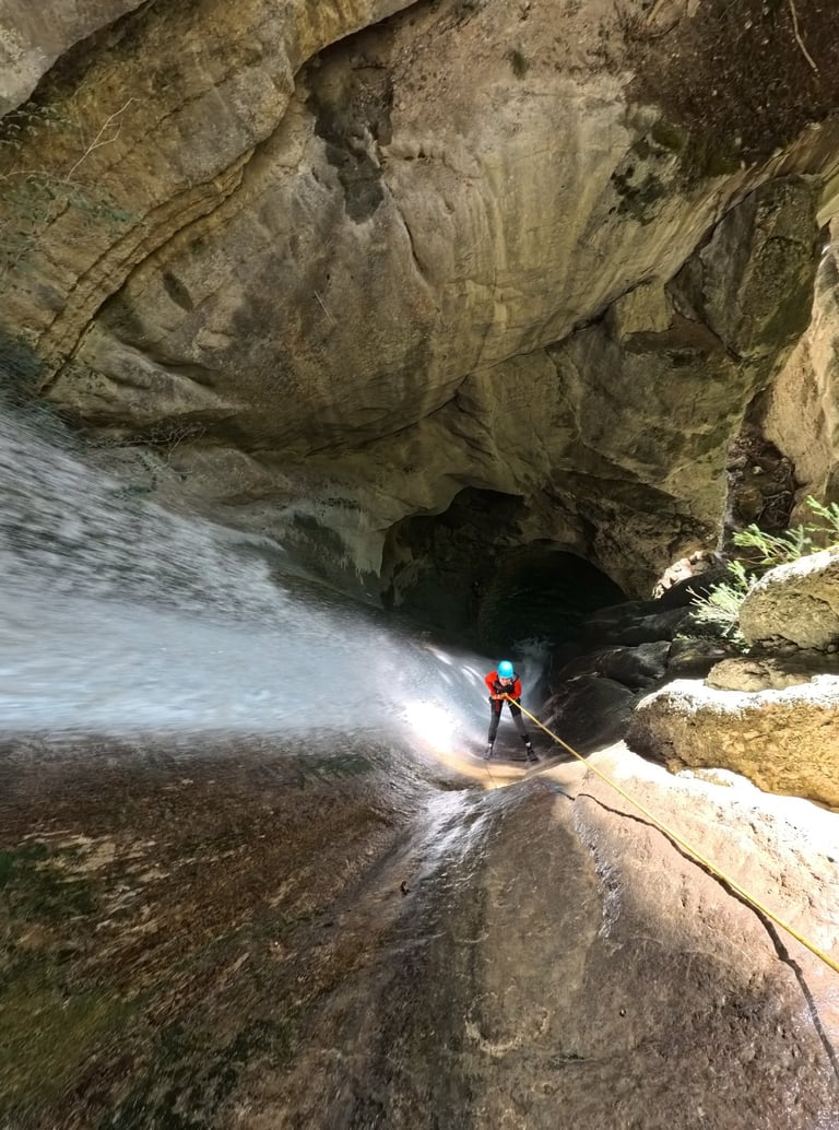 Après quelques petites cascades pour s'échauffer, l'obstacle majeur du canyon se présente : La cascade d'Angon. Haute de 60 mètres, cette goulotte parfaitement sculptée par l'eau vous laissera un souvenir impérissable . Vous saluerez au passage les promeneurs venus contempler cette chute vertigineuse depuis la passerelle touristique .